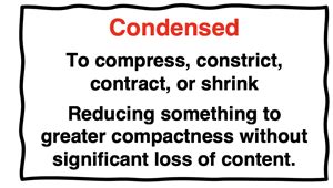 Another Word For Condensed. Concentrate, contract, abbreviate, compress, abridge, constrict, digest, consolidate, reduce, shorten, press together, boil down, capsulize;. Maxims are the condensed good sense of nations.