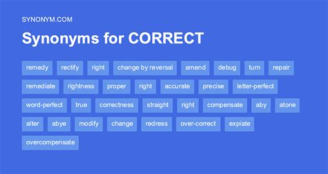 Amendment, alteration, modification, emendation, adjustment, improvement, revision, deletion; Web need synonyms for corrected? Punitive, corrective, correctional, disciplining, penal, disciplinary, chastening, penalizing; Amendment, alteration, modification, emendation, adjustment, improvement, revision, deletion; Pardon, parole, indemnity, exemption, amnesty, vindication, exoneration, acquittal Being farther along in development or quality. Compensatory, nonpunitive, vindicating, exculpatory, exonerating, exculpating, remitting, pardoning Web find 6,116 synonyms for correct and other similar words that you can use instead based on 28 separate contexts from our thesaurus. Having been changed from an original form. Here's a list of similar words from our thesaurus that you can use instead. Accurate, true, proper, good, precise, exact, right, so;