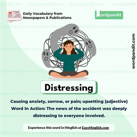 Troubled, perturbed, agitated, disturbed, unsettled, restless, upset, restive; Agony, anguish, pain, misery, discomfort, torment, tribulation, torture; Contexts adjective upsetting, or causing anxiety, sorrow or pain causing worry, distress or anxiety characterized by, or tending to cause, agitation, fear or anxiety. On this page you'll find 99 synonyms, antonyms, and words related to distressing, such as: Contexts noun extreme anxiety, sorrow, or pain difficulty, especially when caused by lack of money the state of a ship or aircraft when in danger or difficulty and needing help. Reassuring, settling, soothing, calming, comforting, relaxing, narcotic, consoling Relief, comfort, consolation, solace, ease, alleviation, security, peace On this page you'll find 391 synonyms, antonyms, and words related to distress, such as: Ache, affliction, anguish, anxiety, blues, and care. More noun extreme anxiety, sorrow, or pain anguish agony pain suffering torment affliction misery torture woe anxiety discomfort Disturbing, unsettling, troubling, frightening, upsetting, troublesome, scary, nasty;