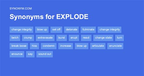 Web more 1110 explode synonyms. [verb] to drive from the stage by noisy disapproval. Search for synonyms and antonyms. Web as the rescue efforts continue, here are three scenarios of what could have happened. Web synonyms of exploded exploded 1 of 2 adjective definition of exploded as in blasted synonyms & similar words relevance blasted smashed shattered broken busted. Web find 46 ways to say explode, along with antonyms, related words, and example sentences at thesaurus.com, the world's most trusted free thesaurus. Web find 2,291 synonyms for explode and other similar words that you can use instead based on 16 separate contexts from our thesaurus. Synonyms change integrity blow up set off detonate fulminate rhymes with explode overflowed bestrode plateaued. “the team of fortune hunters headed deep into the valley to explore for gold.”. Web find 1,771 synonyms for explodes and other similar words that you can use instead based on 16 separate contexts from our thesaurus.